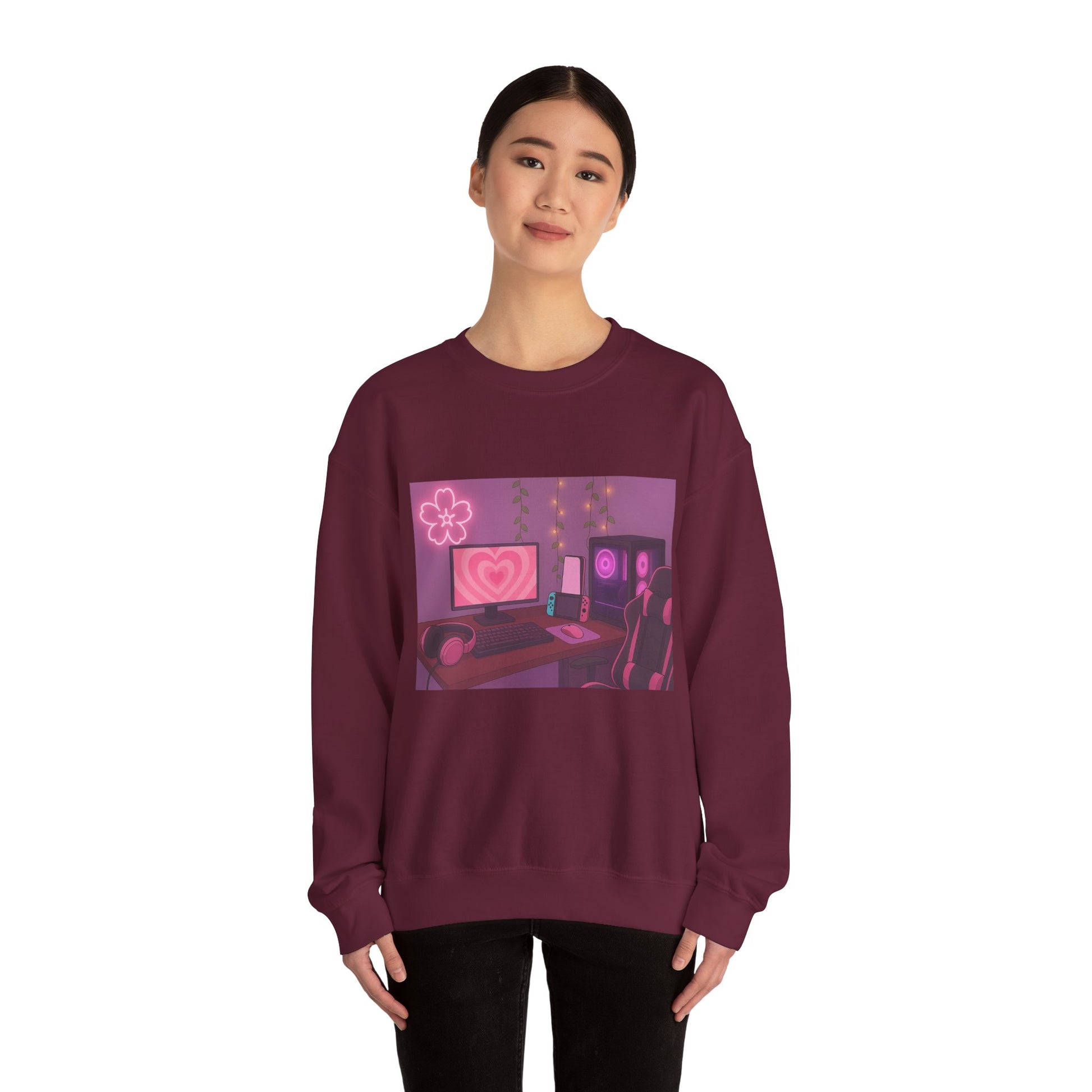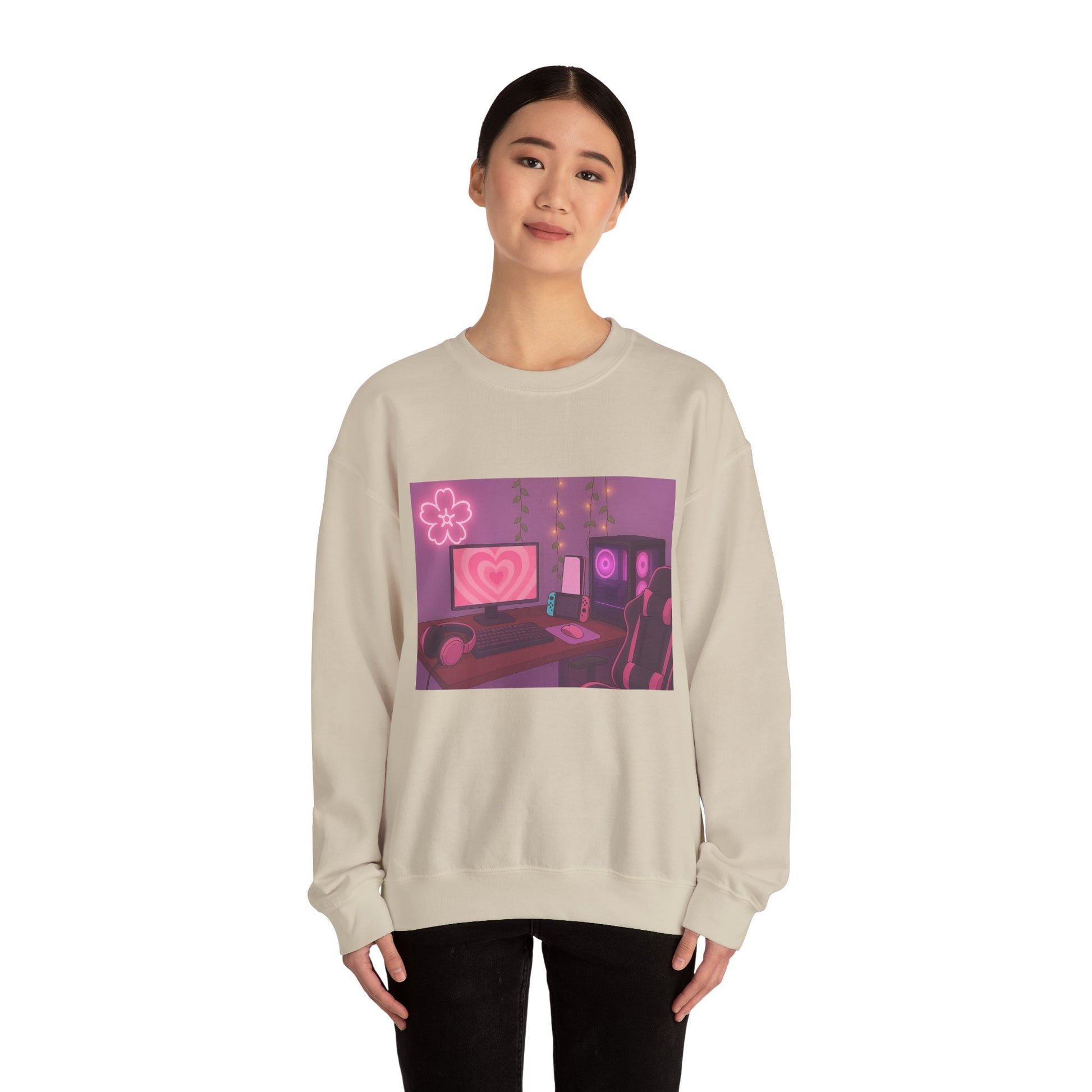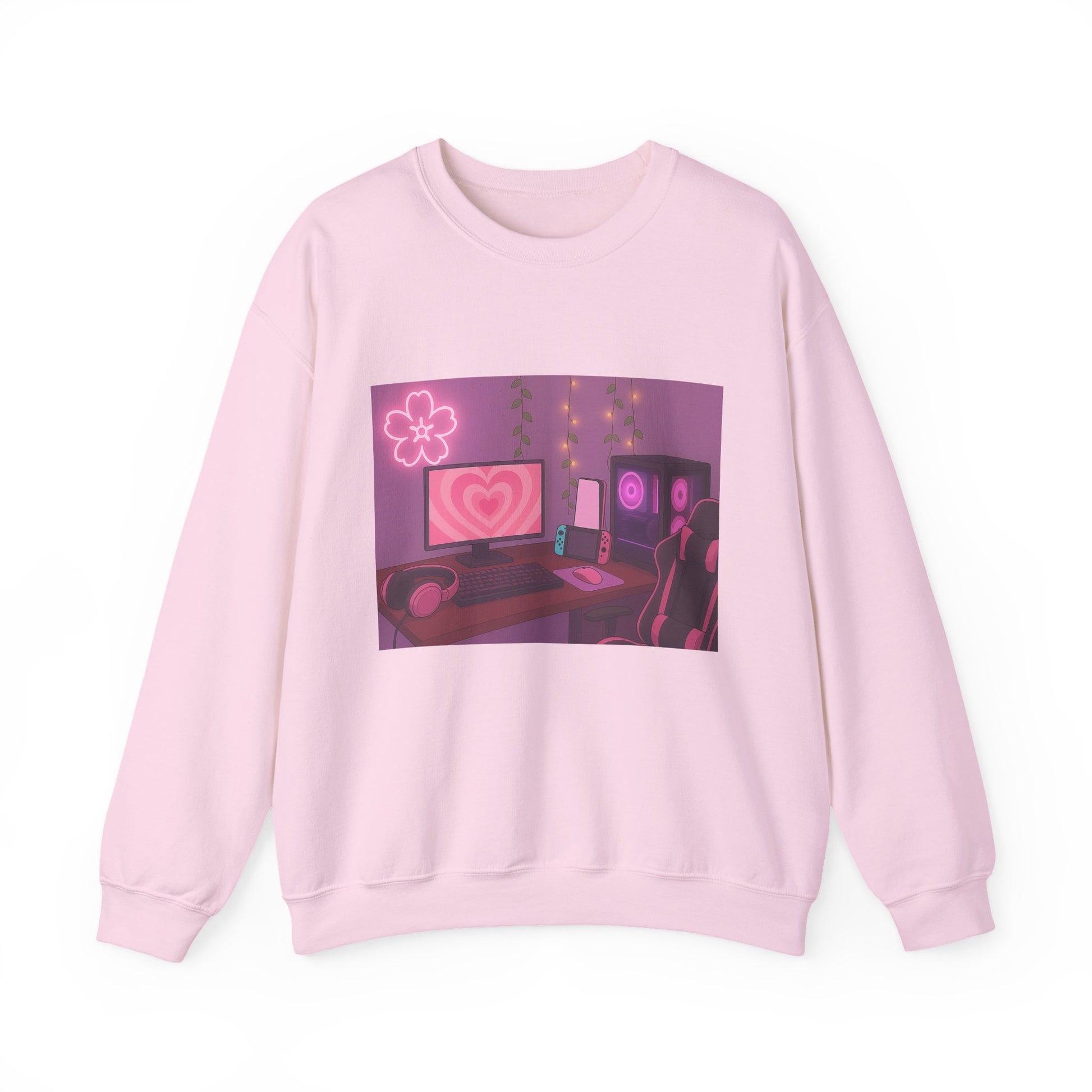 Stay warm and stylish with this Cozy Gamer Setup Sweatshirt, featuring a soft pink gaming desk illustration that brings all the comfy gamer-room vibes. This crewneck showcases a pink-lit PC, heart-filled monitor, Switch console, headphones, vines, and neon flower light, creating the perfect aesthetic setup for anyone who loves a chill gaming space.
