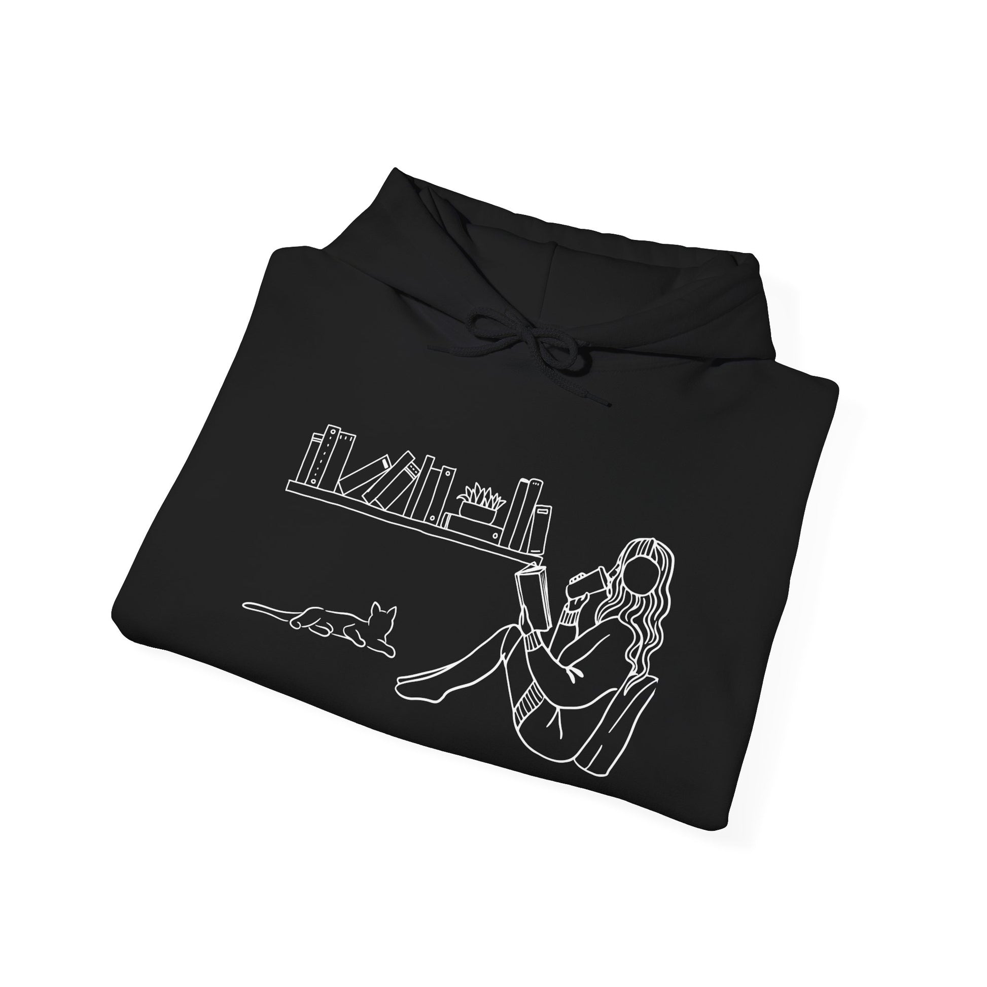 Cozy Reading Girl & Cat Hoodie – Minimalist Line Art Book Lover Sweatshirt